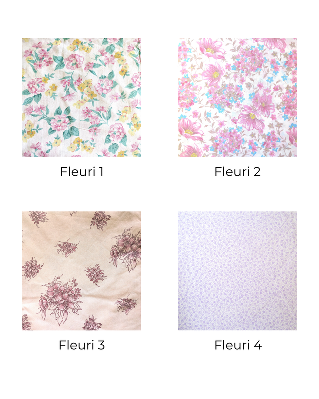 Les tissus proposés sont des draps ou du linge de maison de seconde main 100% coton (certains peuvent comporter une proportion de synthétique, contactez moi pour toute question)