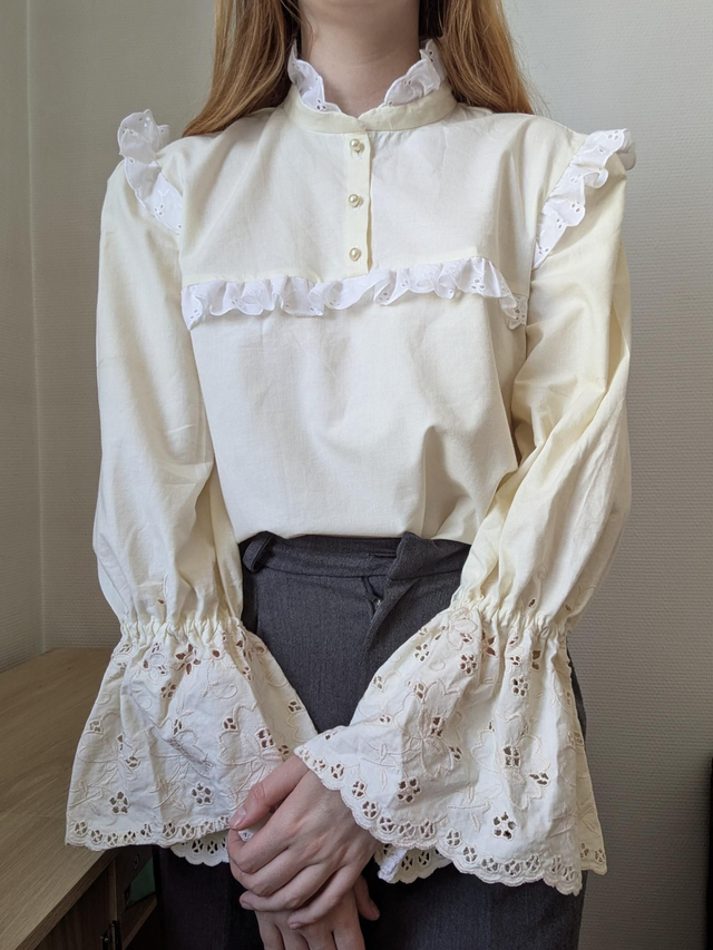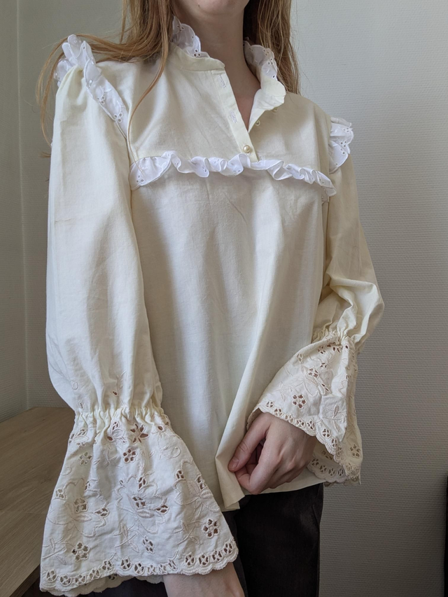 Blouse victorienne cousue à la main à partir d'un drap jaune beurre 100% coton et de broderie anglaise vintage ✨